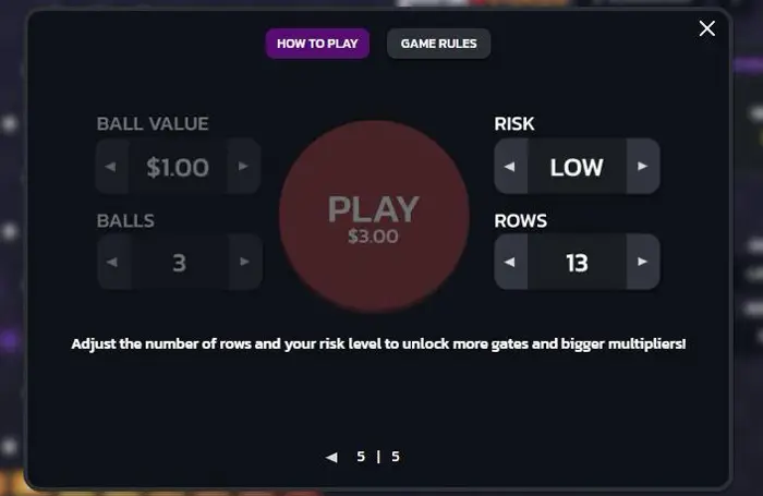 Select your bet amount, and tap the Play button to drop plinko balls onto the game board.